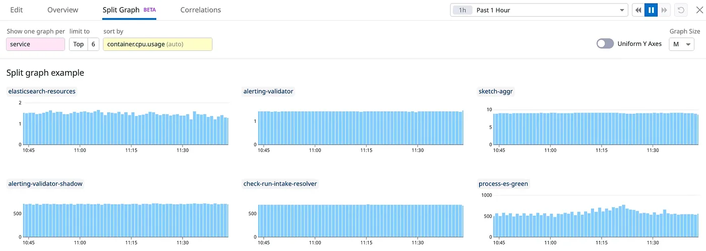 If you prefer metrics, the datadog.estimated_usage.logs.ingested_bytes metric can provide a clear visualization of log volume. A standout feature is Split Graphs, which allows you to break down graphs by category for better clarity and actionable insights.